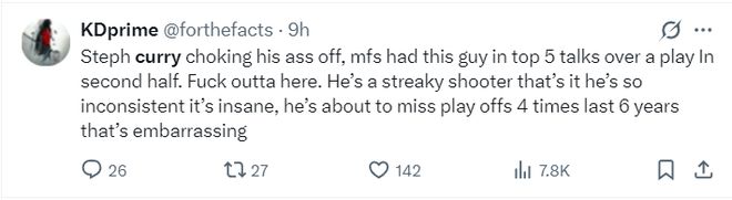 美媒:库里简直要气炸了,那些家伙居然因为一次进攻就把库里列为联盟最佳球员候选人之一。他下半场他的表现极为拉胯。他只是一个状态起伏很大的投手而已,他的表现太不稳定了,过去六年已经四次无缘季后赛,太丢人了。
