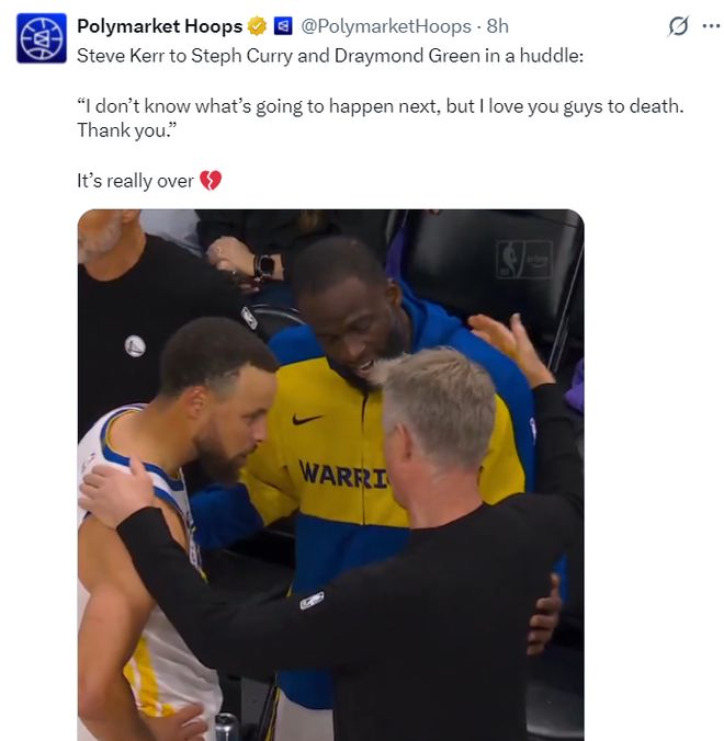 在比赛结束前,科尔抱着库里与追梦说道:我不知道接下来会发生什么,但我真的非常爱你们。谢谢你们。