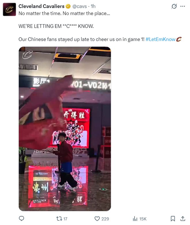 赛后骑士官方致谢中国球迷的应援,在江苏省常州市有中国球迷包下电影院直播骑士VS猛龙的首轮G1,还有一位小球迷拿着骑士的旗帜挥舞着。
