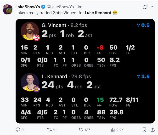 比赛还在进行中,湖人媒体晒出文森特老鹰首战季后赛15分钟2分2助攻,肯纳德33分钟已经拿到24分。