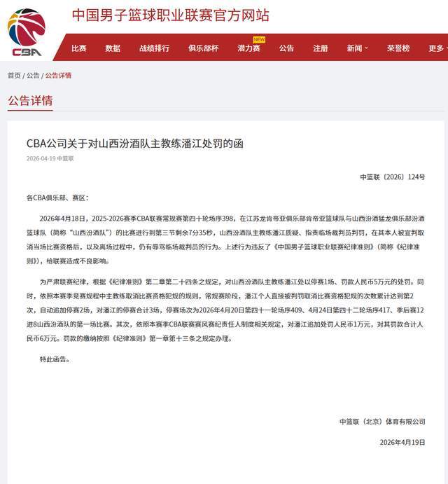 北京时间4月19日消息,CBA常规赛收官阶段,山西汾酒队却接连遭遇打击。4月19日,CBA公司公布处罚决定,球队主教练潘江因在与江苏肯帝亚队比赛中指责、辱骂裁判员,被处以停赛3场、罚款6万元的处罚。这意味着他将缺席常规赛最后两场对阵广东宏远和南京同曦的比赛,以及季后赛12进8的首场对决。雪上加霜的是,这已经是山西队本赛季收到的第四张罚单,罚单数量领跑全联盟,赛场纪律问题俨然成为球队前进路上的绊脚石。