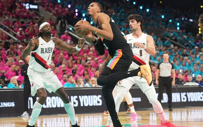 作为呼声颇高的MVP候选人,文班亚马虽然是首次征战季后赛,却在这场比赛中充分展示了何为“瞎眼可见的天赋”。前辈“石佛”邓肯和“上将”大卫-罗宾逊等传奇名宿亲临现场,并没有让文班亚马怯场,反而迸发出了更强大的战斗力。面对克林根和罗威这对内线组合的轮番消耗,文班亚马巧妙化解了开拓者对自己的针对性防守,凭借后卫的速度、锋线的敏捷、内线的身高,文班内外结合做得非常棒,他在油漆区的统治力毋庸置疑,篮下11次出手命中7球,与此同时,文班亚马的外线投射简直有如神助,三分线外他交出了6投5中的成绩单,如此表现对手根本没有办法加以限制。