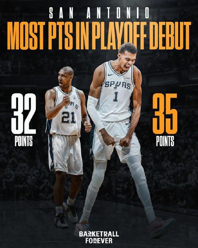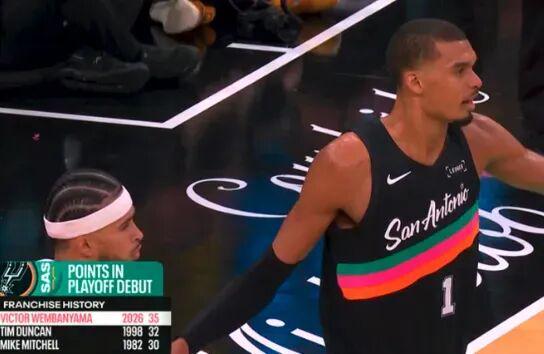 文班亚马的35分,超越邓肯的32分,打破了马刺队史季后赛首秀得分纪录。