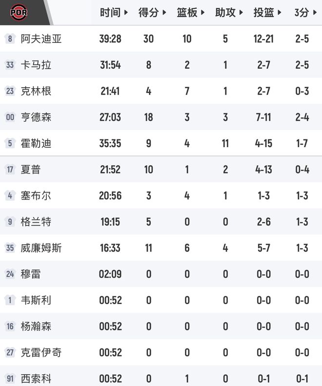 马刺在第四节打出6-0,21分的分差!之后开拓者又开始追分,比赛还有2分钟时,开拓者96-108马刺,胜负悬念不大了。最终,开拓者以98-111败给马刺,从没在季后赛客场赢过马刺,0胜11负!遇到了魔鬼主场。文班亚马本场21中13,三分6中5,稳稳拿下35分5板,带领马刺创下NBA成立80年来季后赛对开拓者全胜的纪录。阿夫迪亚尽力了,21中12,30分10板5助。