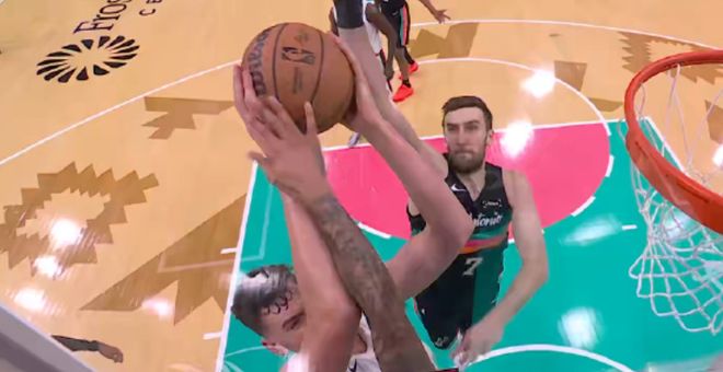 还是文班亚马带队,马刺通过强力的内线护筐打出防守反击,在第四节还剩9分钟的时候由文班亚马翻身投篮命中,以100比79领先了21分,这是全场比赛最大的领先分差。