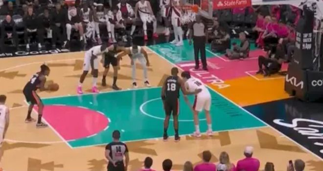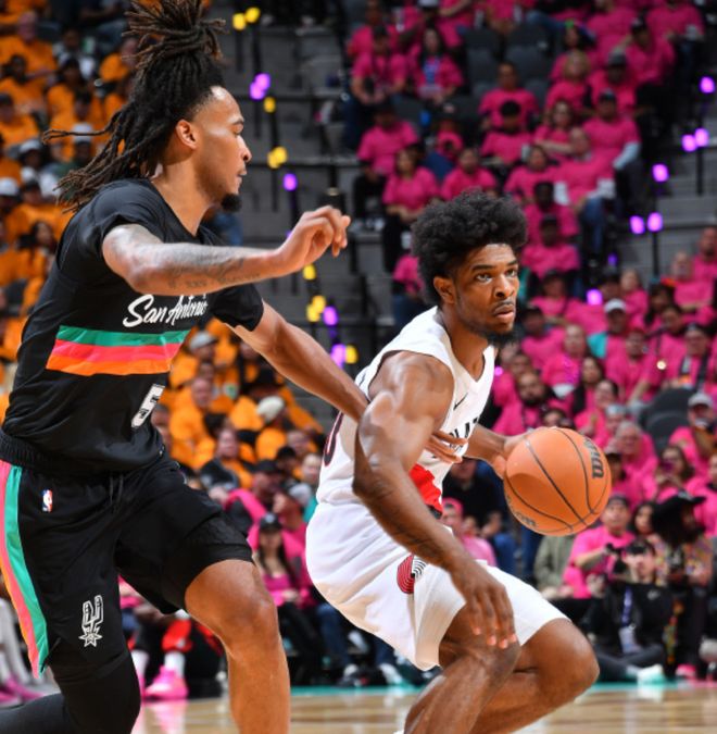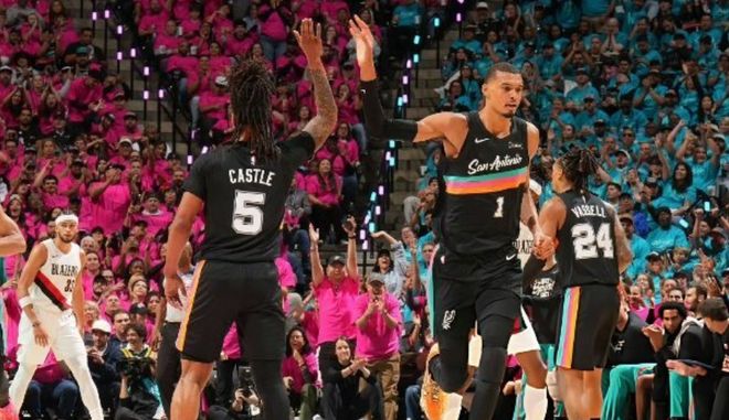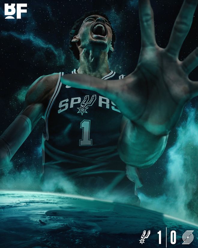 马刺刚好相反,他们拥有极为恐怖的内线文班亚马,整套阵容几乎全是投手——瓦塞尔、尚帕尼、约翰逊、巴恩斯——控球人也有福克斯、卡斯尔和哈珀三人换着用。