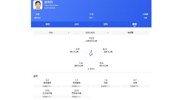 本赛季赵率舟加盟吉林男篮,赛季初还能获得一些出场机会,也有部分比赛能打出高光表现。但随着赛程推进,他横移速度慢,防守容易被针对的缺点开始暴露,之后便被教练组弃用。