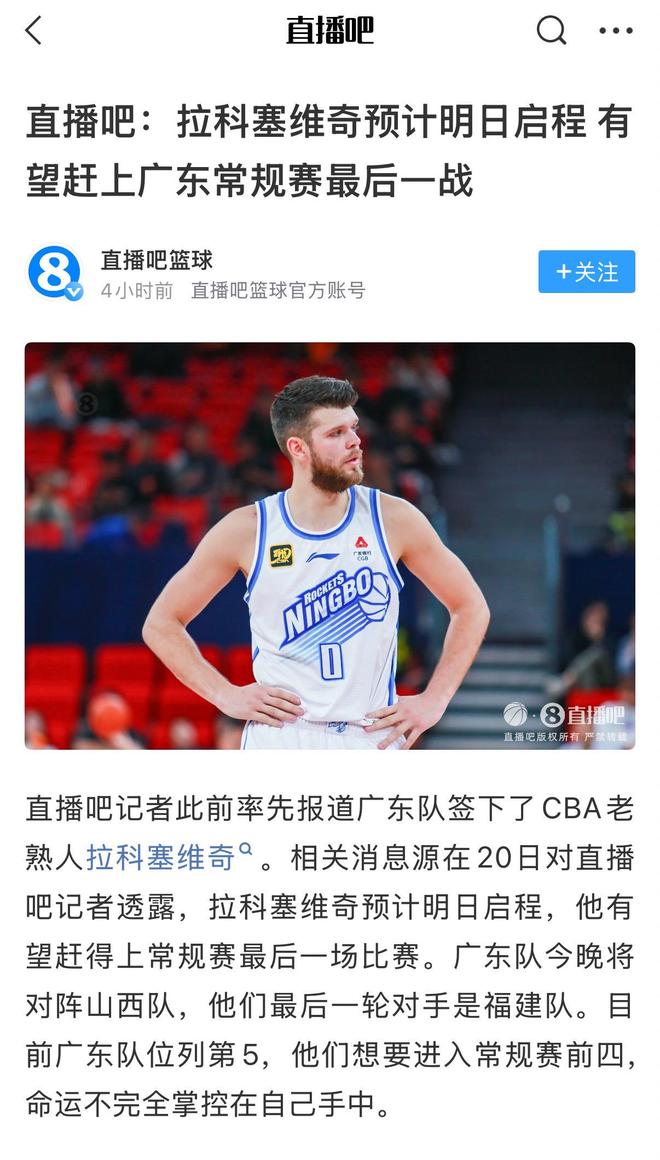 著名篮球记者赵探长确认了此事,表示“拉科确实计划是先参加完婚礼,再来CBA”。第一时间报道拉科加盟广东的媒体直播吧则透露,拉科塞维奇预计明日启程,他将有望赶得上常规赛最后一场比赛!