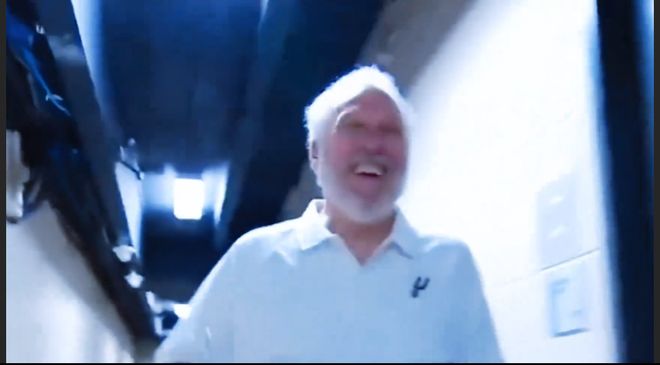 就连此前因为中风行动不便的主教练波波维奇,也拖着“疲惫不堪”的身躯,来到了比赛现场。