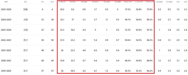 数据显示,比尔22-23赛季常规赛(奇才),场均23.2分3.9板5.4助;23-24赛季常规赛(太阳)场均18.2分4.4板5助1断,以及24-25赛季常规赛(太阳)场均17分3.3板3.7助1.1断;本赛季常规赛(快船),场均8.2分0.8板1.7助。