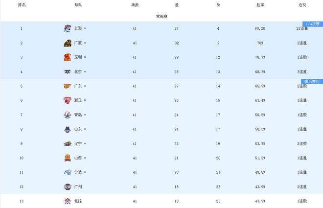 随着广东输球,北京与深圳双双锁定常规赛前四席位,两队最终谁能拿到第三名,将由最后一轮比赛结果决定:深圳若击败广州,直接稳居第三;若深圳输球、北京击败吉林,则北京升至第三。