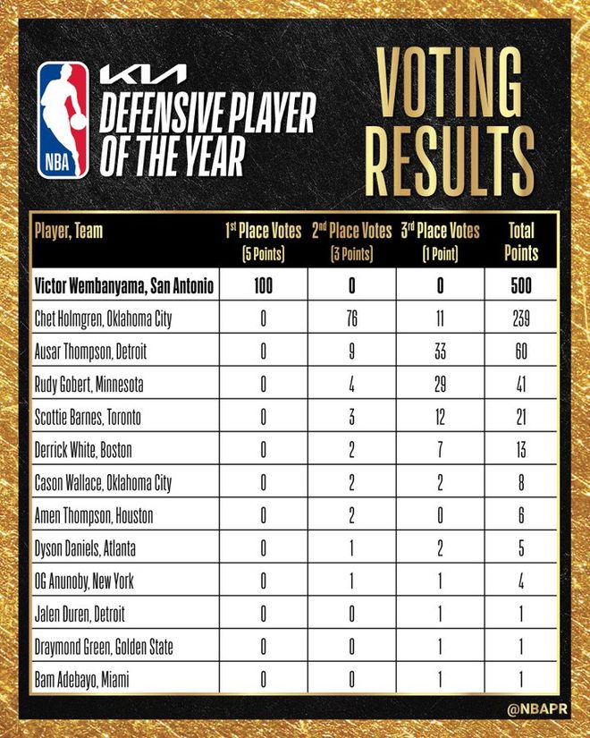 此前接受采访时,文班亚马就曾自信表态:如果无法全票当选年度最佳防守球员,我会感到意外。这位马刺核心不仅稳定领跑最佳防守球员榜单,更重新定义了一名防守球员所能达到的统治级别。