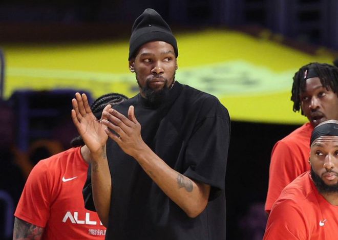 这位明星前锋因上周四训练中遭遇右膝挫伤,缺席了周日的季后赛首战,火箭也输掉了这场揭幕战。在媒体开放的小段训练时间里,这位37岁球星的状态看上去基本恢复如常:他完成跳投、折返跑动、变向移动,动作没有非常明显受限,全程面带笑容。唯一明显的差别就在他的右膝:杜兰特的膝盖缠着运动胶带固定的防护绷带。