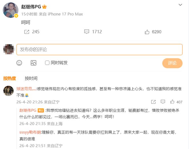 “呵呵。”赵继伟写道,随后他又在评论区继续表示,“我想找地缝钻进去知道吗?这么多年职业生涯,输赢都有过,惜败惨败被绝杀什么什么的都见过,一场比赛而已,今天…俩字!呵呵!”