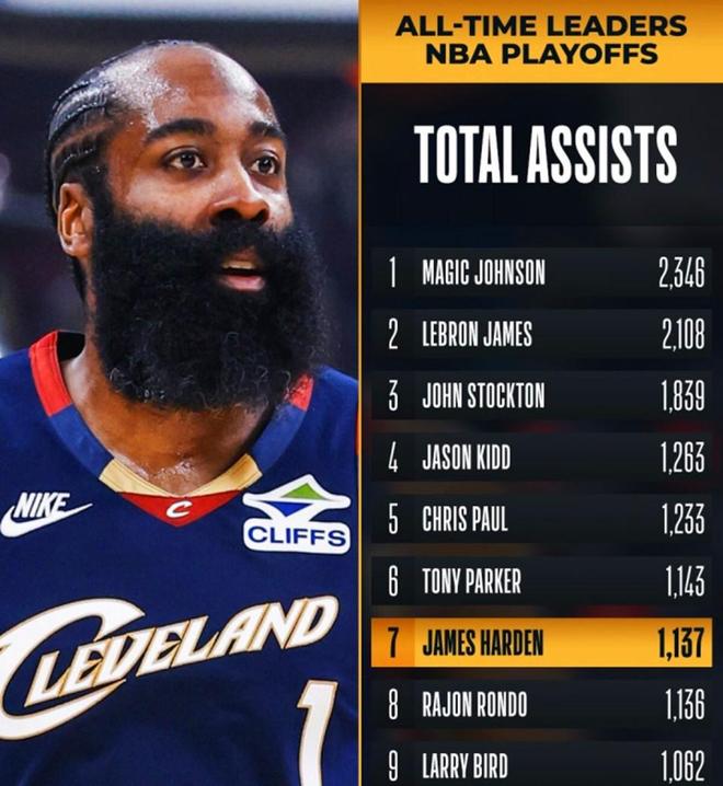 哈登在比赛第三节送出生涯第1137次助攻,成功超越隆多升至NBA历史第7名!