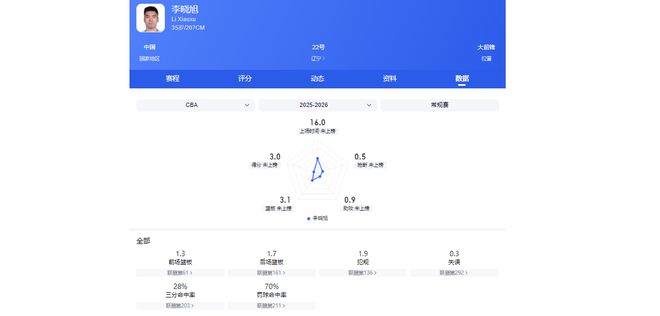 他场均数据只有3.8分1助攻左右,三分命中率低至28.8%。