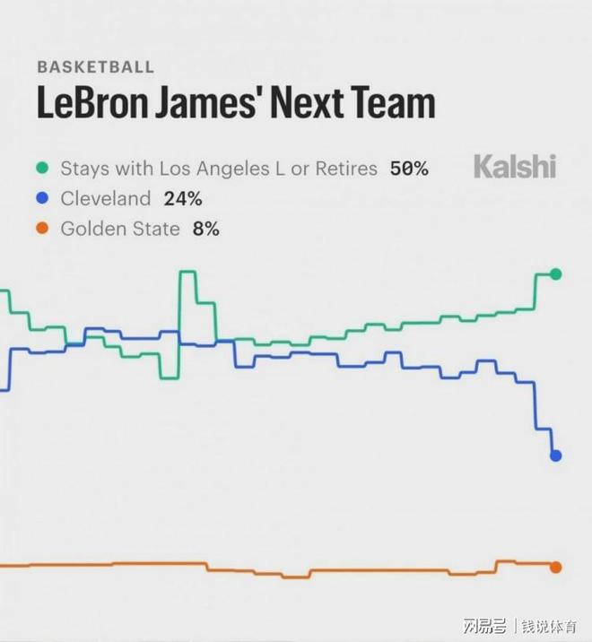 北京时间4月22日,NBA季后赛激战正酣,湖人球星詹姆斯的未来去向再次成为外界焦点。知名体育预测平台Kalshi Hoops更新了他下赛季的归属概率,数据显示,詹姆斯留在湖人或直接退役的可能性相加高达50%,其余潜在下家则分布较为分散。