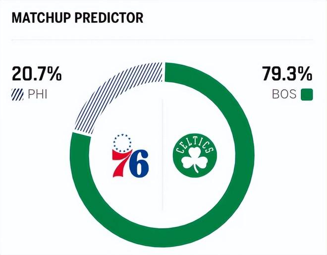 赛前,美媒ESPN对本场比赛进行了胜率预测,凯尔特人胜率高达79.3% ,76人队胜率则仅有20.7% ,差距依旧明显。