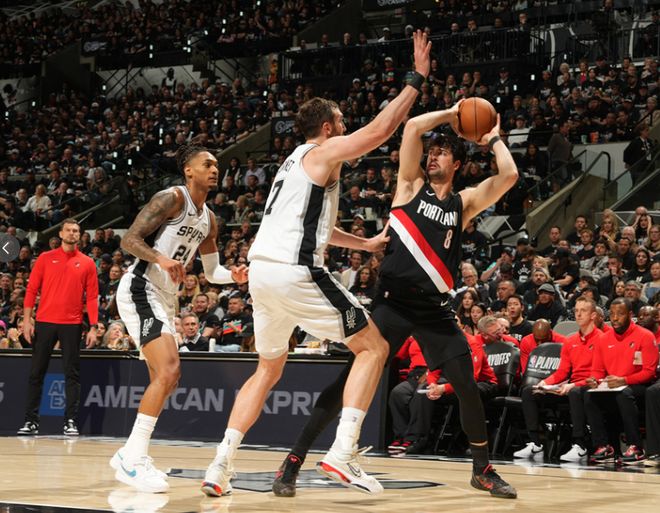系列赛首场比赛马刺主场111-98战胜开拓者,第二场开拓者缺少利拉德,马刺缺少加西亚与麦克劳林。本场首节开局马刺4-2领先,亨德森连中三分引领一波13-0攻势反超比分,马刺连追5分。开拓者连得7分扩大13分优势,卡斯尔攻传结合表现,引领马刺打出一波14-3攻势追到差2分,罗威空接暴扣。马刺继续反扑缩小差距,首节比赛结束马刺28-27领先开拓者。首节开拓者23中9,其中三分9中5,亨德森3记三分13分;马刺22中10,其中三分7中3,卡斯尔10分。