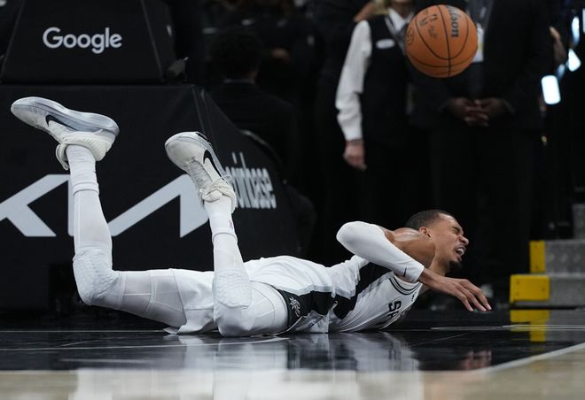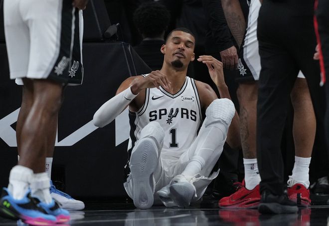 文班亚马第二节仅打3分钟,在一次空中碰撞后倒地,他的脑袋在地板上磕了一下,随后文班亚马捂着自己的下巴,队医让他进入更衣室检查。马刺官方很快给出消息,文班亚马因为脑震荡保护程序缺席G2余下比赛,NBA球员脑震荡保护平均时间7-10天。