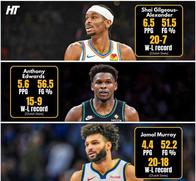 而作为球队主将,本赛季亚历山大在关键时刻的表现堪称恐怖。本赛季关键时刻,场均得分6.5分,关键时刻总得分高达175分,两项数据均排名联盟第一。更夸张的是,在这种高压时刻下,亚历山大的投篮命中率高达51.5%。