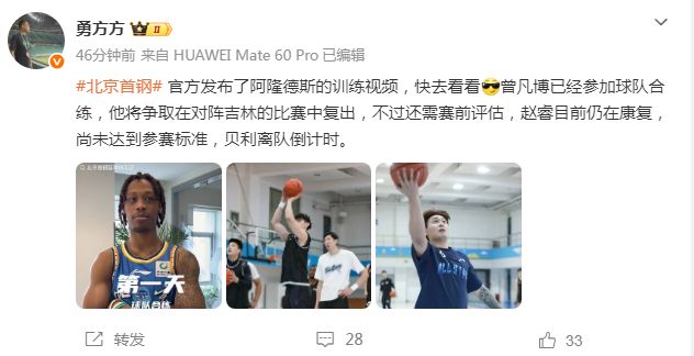 至于北京男篮的两位主力球员,曾凡博已经参加球队合练,他争取在对阵吉林男篮的常规赛收官战比赛中复出,还需要进行赛前评估。