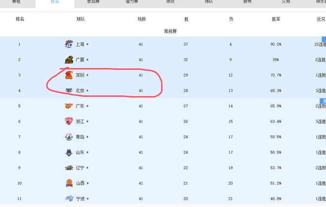 因为41轮后,深圳第三,29个胜场,但近期1连败,最后一轮对阵赢球才能进季后赛的广州队,后者肯定会全力以赴;北京虽第四,28个胜场,但近期3连胜,最后一轮对阵提前出局的吉林队。因此,最后一轮北京队从排名上反超深圳的可能性较大。(北京潜力赛成绩占优)