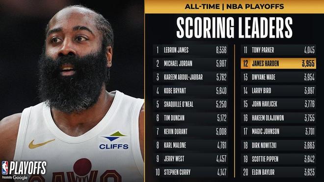 第2、下半场中段哈登命中2+1之后,哈登的季后赛总得分提升到3955分,成功超越德怀恩韦德升至历史第12位。