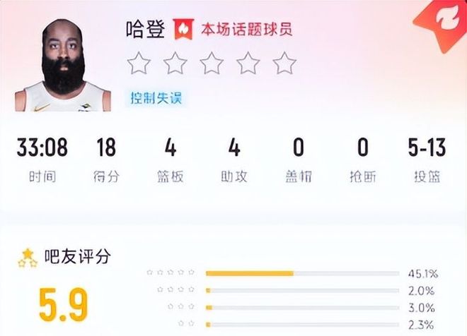 哈登正负值定格在-17,全场在场时间33分钟内,球队净输17分;作为生涯场均助攻7.2次、失误仅3.1次的历史级控场大师,单场8次失误无疑是一记沉重耳光。
