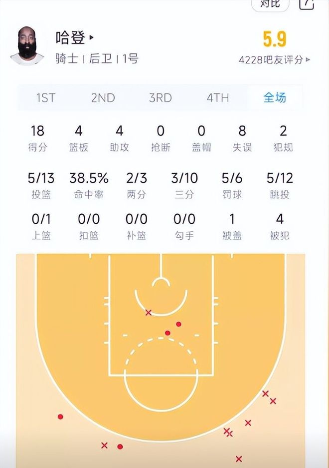 作为球队战术中枢与组织核心,哈登本场出战33分钟,13次投篮命中5球,三分线外10投3中,砍下18分4篮板4助攻。纸面数据尚可,但8次失误如芒在背,几乎等同于亲手为对手输送8次快攻机会。