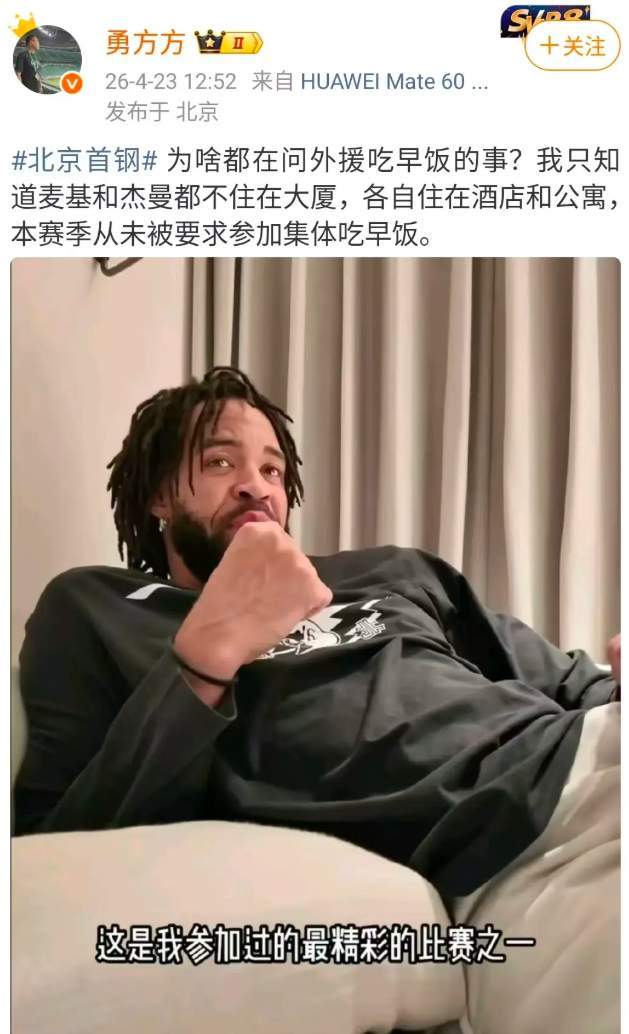 然而,这些传闻在权威媒体人勇方方的直接回应下迅速崩塌。他在社交媒体明确表示:“为啥都在问外援吃早饭的事?我只知道麦基和杰曼都不住在酒店和公寓,本赛季从未被要求参加集体吃早饭。”这一声明直击核心——若从未被要求,便无“不服从”之说。所谓“管理失序”“外援特殊化”,纯属无中生有。首钢男篮的日常管理从未因外援而改变,更无“区别对待”之实。