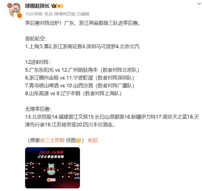 言归正传,CBA本赛季常规赛已经落下帷幕,季后赛首轮对决如下: