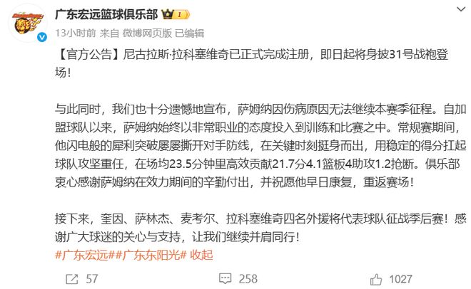 拉科塞维奇替代的是萨姆纳,后者因为伤病赛季报销,出战33场首发11次,场均上阵23.5分钟贡献21.7分4.1板4助1.2断,投篮命中率高达51.3%,本来是广东队最为出色的外援,无奈天不遂人愿。