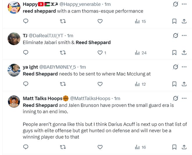 太多的火箭球迷对谢泼德忍无可忍了:1.连球都拿不住;2.篮下上篮都上不进;3.我觉得我都比谢泼德更强;4.实在是太差劲了,这还给他更多登场时间;