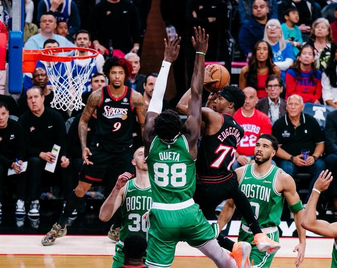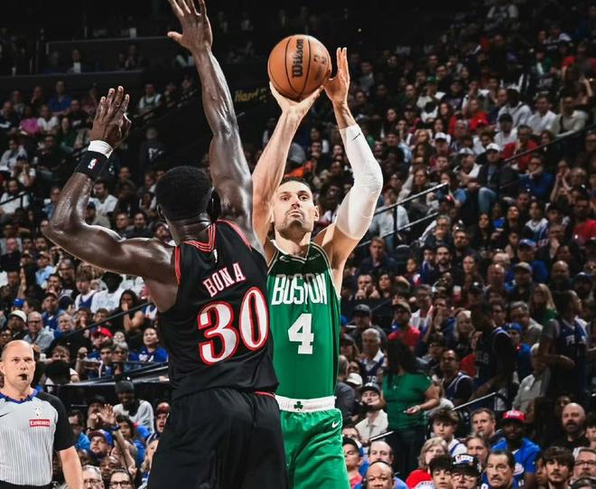 本场比赛,双方在首发阵容上面,76人这边派出的是,马克西,乔治,乌布雷,博纳,埃奇库姆。凯尔特人这边派出的是,塔图姆,布朗,怀特,豪瑟和克塔。首节比赛开始,凯尔特人率先拿到球权,布朗节奏变换上篮得手,打进本场比赛首个进球,埃奇库姆闪电突破飞身抛投也为76人开张,乌布雷的底角三分开火一击命中,博纳篮下强起,自投自抢补扣得手,普理查德的定点三分开火一箭穿心,马克西不甘示弱,追身大号三分立马回应一球,布朗的正面干拔三分球同样也进。马克西借助掩护,电光火石上篮挑落两分,武切维奇的侧翼三分发炮空心入网。