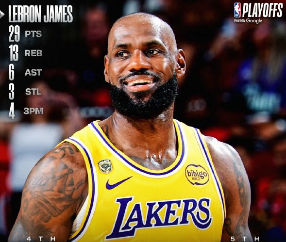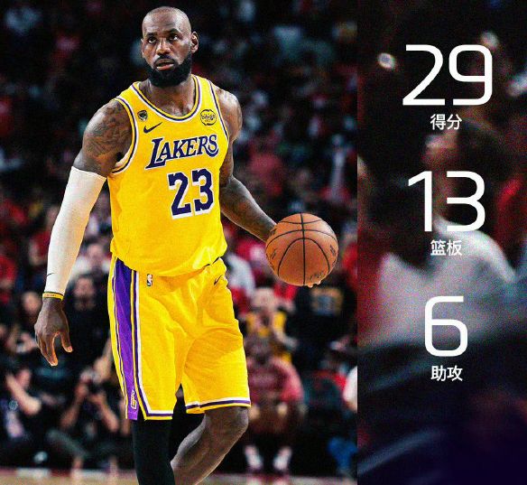 4月25日,NBA季后赛首轮G3,湖人112比108击败火箭,首轮大比分3比0领先火箭,本场比赛詹姆斯出战45分钟,全场22投10中,三分球9投4中,贡献29分13篮板6助攻3抢断。