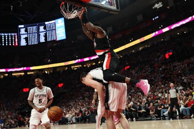 开拓者(1-3):阿夫迪亚26分7篮板3助攻,霍勒迪20分6篮板4助攻,格兰特17分5篮板,杨瀚森出场1分31秒没有数据进账。
