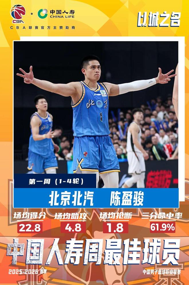 12月15日对阵新疆,陈盈骏在三分线外8投7中,狂砍29分5篮板8助攻,正负值高达+37;两天后面对辽宁,他又用全队最高的26分帮助球队啃下硬仗,凭借新赛季一开始的良好状态,拿下第一周中国人寿周最佳球员。
