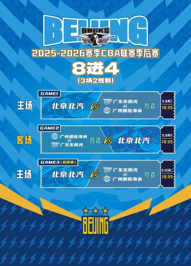 5月6日八进四主场比赛门票已经在【票星球】各渠道火热销售中,点击这里北京男篮季后赛购票链接即可购票,用全员合力的声浪为将士保驾护航,用赤诚热爱助力球队全力冲锋!