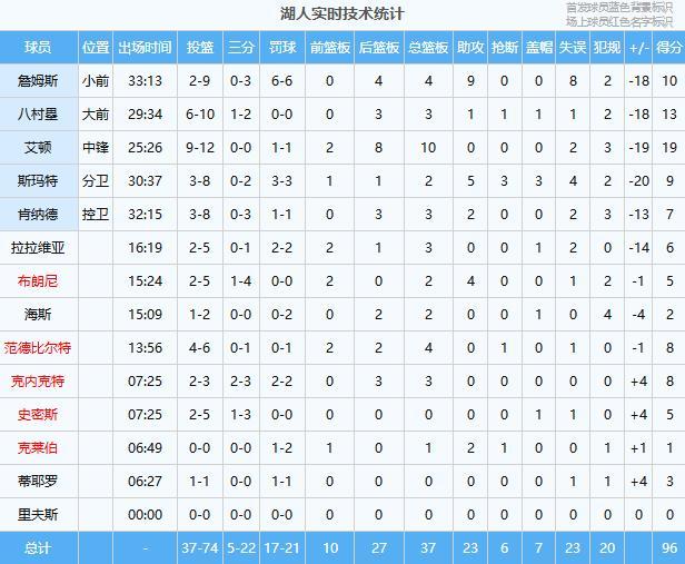 艾顿19分10板、八村塁13分3板1助、詹姆斯10分4板9助、斯玛特9分2板5助3断3帽、范德比尔特8分4板、克内克特8分3板、肯纳德7分3板2助、拉拉维亚6分3板