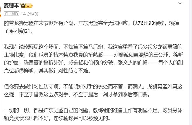 深层次的原因,在于2方面,首先是没有做好针对性防守,赛后广东媒体人“麦穗丰”指出了这方面的原因,表示:其实广州的技术特点并没有那么复杂,徐昕护框、刘颜诚、袁照耀三分,陈国豪挡拆外弹,威金顿伯顿突破,广东做好针对性防守并不难,但广东队这场并没有去做好防守针对,教练组的准备工作有明显不足。