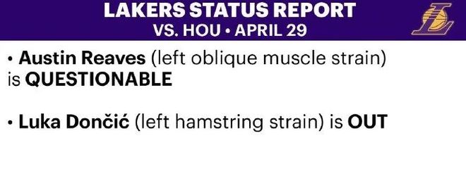 湖人:里夫斯左侧腹斜肌拉伤已经升级为出战成疑,东契奇左腿筋拉伤仍将缺席比赛。