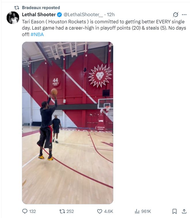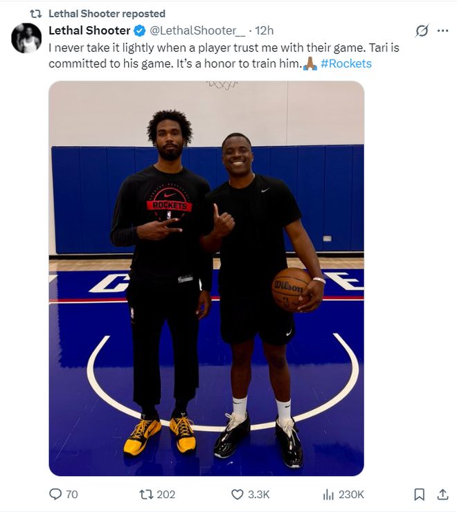 北京时间4月28日,全美著名的投篮训练师Lethal Shooter官方公布了他为塔里-伊森进行了投篮特训,伊森在最近的两天里除了日常训练外还专门来拜师苦练外线投射。(绿凯核心杰伦-布朗也曾拜师Lethal Shooter)