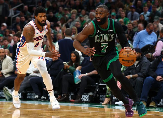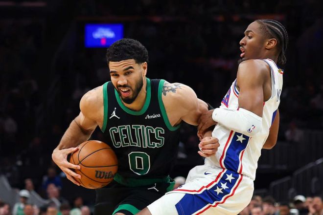 在季后赛首轮前四场比赛,凯尔特人总分3-1领先夺得赛点。本场首节乔治率先三分命中,怀特抛射命中,乌布雷上篮与乔治三分命中扩大优势,布朗滑翔暴扣。马克西中投命中,布朗连追4分,埃奇库姆三分命中,塔图姆引领一波8-2攻势反超1分。马克西中投得分,谢尔曼三分命中,马克西中投得分,普里查德中投与武切维奇暴扣,马克西上篮追分,首节结束凯尔特人23-21领先76人。首节外线三分准星均不佳,76人三分13中3,凯尔特人三分10中1。