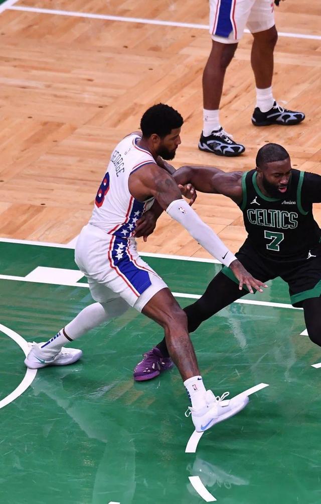 出手数不多,但效率极高,把更多的精力放在了限制双探花这里。如果你仔细看看乔治的防守回合,他对于布朗和塔图姆的防守是教科书级别的,堪称是老一辈顶级3D的防守艺术。布朗今天只有23中9,越打越较劲,被乔治上了一课。要知道年轻的时候,乔治防守的都是勒布朗这个级别。