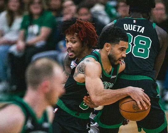 本场比赛,双方在首发阵容上面,凯尔特人这边塔图姆,布朗,怀特,豪瑟,克塔。76人这边派出的是,恩比德,乔治,乌布雷,马克西和埃奇库姆。首节比赛开始,76人率先拿到球权,乔治的追身三分开火一击命中,打进本场比赛首个进球,怀特单枪匹马杀进篮下抛投出手,也为绿军开张,乌布雷扛着篮球横冲直撞擦板命中,乔治丝滑运球,漂移三分张手就有,马克西高难度的翻身中距离也拿下两分,克塔禁区吃饼,高举高打攻筐上篮命中,布朗的后撤步干拔跳投空心入网,首节比赛两队都以内线进攻为主,还没有找到外线状态。