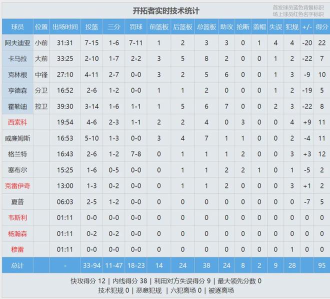 霍勒迪上半场9中1,卡马拉5中1,亨德森4中1!开拓者全队半场投篮命中率36.5%,三分命中率19%,落后20分也不足为奇。第三节马刺进攻效率下降,单节21-20净胜开拓者1分。三节战罢,马刺86-65领先开拓者21分。