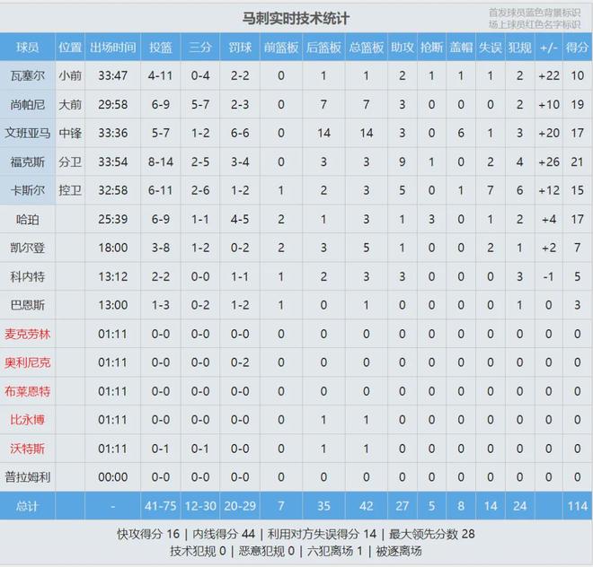 说回今天这场比赛,马刺首发:卡斯尔、福克斯、瓦塞尔、尚帕尼、文班亚马。开拓者首发:霍勒迪、亨德森、阿夫迪亚、卡马拉、克林根。第一节卡斯尔和尚帕尼火力全开,两个人单节合计10中8砍下19分,马刺两分球14中11!
