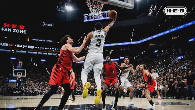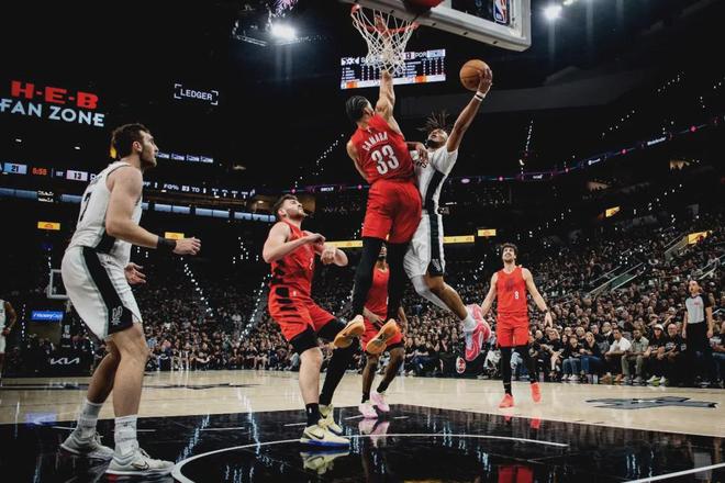 马刺开局轰出16-4,直接把开拓者打懵了。由于分差很快拉开,文班亚马进攻端很克制,首节1投1中仅得2分3篮板1盖帽。第一节打完,马刺36-24领先开拓者12分。第二节刚开始,马刺替补阵容轰出18-4的攻击波,分差来到26分。