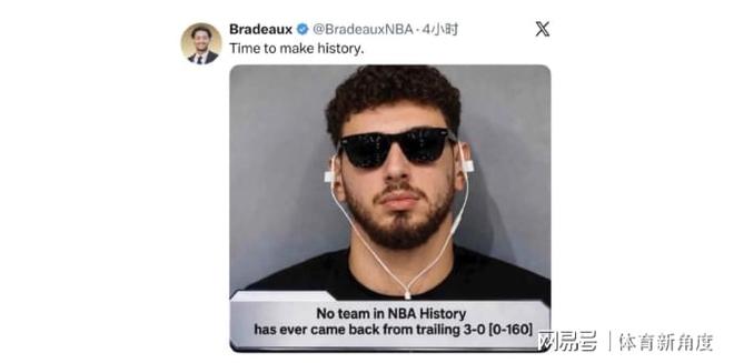 尽管目前大比分落后,但火箭队上下却信心满满。休斯顿记者Bradeaux发布图文表示:“是时候创造历史了。”配图为申京的合成照片,原图取自2016年总决赛骑士队1-3落后勇士队时,詹姆斯接受采访的场景。图中文字写道:“在NBA历史上,尚未有球队能在0-3落后的情况下实现逆转,战绩为0胜160负。
